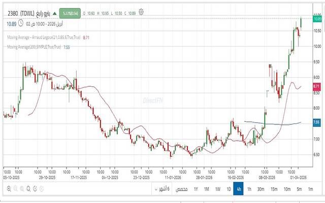 واستمر السهم في مواصلة الصعود ويواجه حالياً مقاومة هامة حول 10.77 ريال، نجاح السعر في اختراق المقاومة من شأنه أن يمهّد الطريق أمام صعود إضافي نحو 11.15 ريال – 11.45 ريال، وفي حال استمرار الزخم الشرائي قد تمتد الحركة الصاعدة نحو 11.70 ريال.