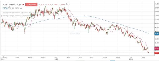 ومع كسر هذا المستوى، تسارعت وتيرة الهبوط بشكل ملحوظ، ليستمر الاتجاه الهابط حتى أبريل 2026، متجاوزًا القاع التاريخي عند 30.20 ريال، ومسجلًا مستويات جديدة أدنى قرب 29.10 ريال، في دلالة واضحة على ضعف الطلب وتراجع شهية المخاطرة تجاه السهم.