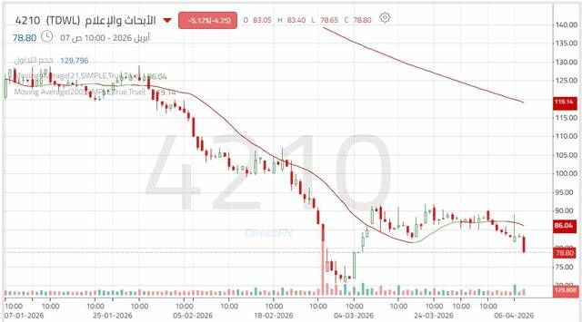 استهل سهم الأبحاث والإعلام تعاملاته خلال عام 2026 بحركة عرضية عقب الاتجاه الهابط الرئيسي الممتد من العام الماضي. ومع بداية شهر فبراير، استأنف السهم الهبوط عبر حركة سعرية متسارعة؛ مما يعكس قوة الضغوط البيعية.