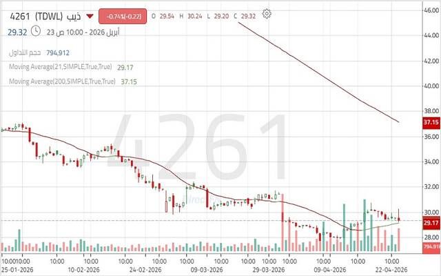 وتعرض سهم ذيب لضغوط بيعية ملحوظة خلال عام 2026، في ظل غياب واضح للزخم الشرائي، حيث اخترق القاع التاريخي قرب 30.20، مسجلاً مستويات أدنى جديدة عند 27.70، في إشارة إلى قوة الاتجاه الهابط وتأثر معنويات المستثمرين تجاه السهم.