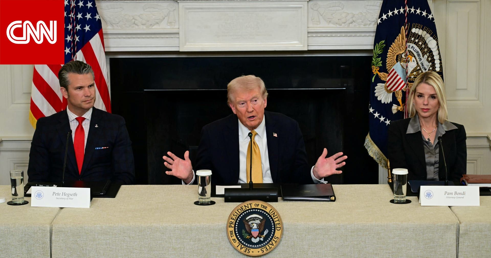 (CNN) -- أصرّ الرئيس الأمريكي دونالد ترامب، الخميس، على أنه يستطيع مواصلة شنّ ضربات ضدّ من وصفهم بـ"مهربي المخدرات في الخارج" دون إصدار الكونغرس إعلان حرب رسميا.