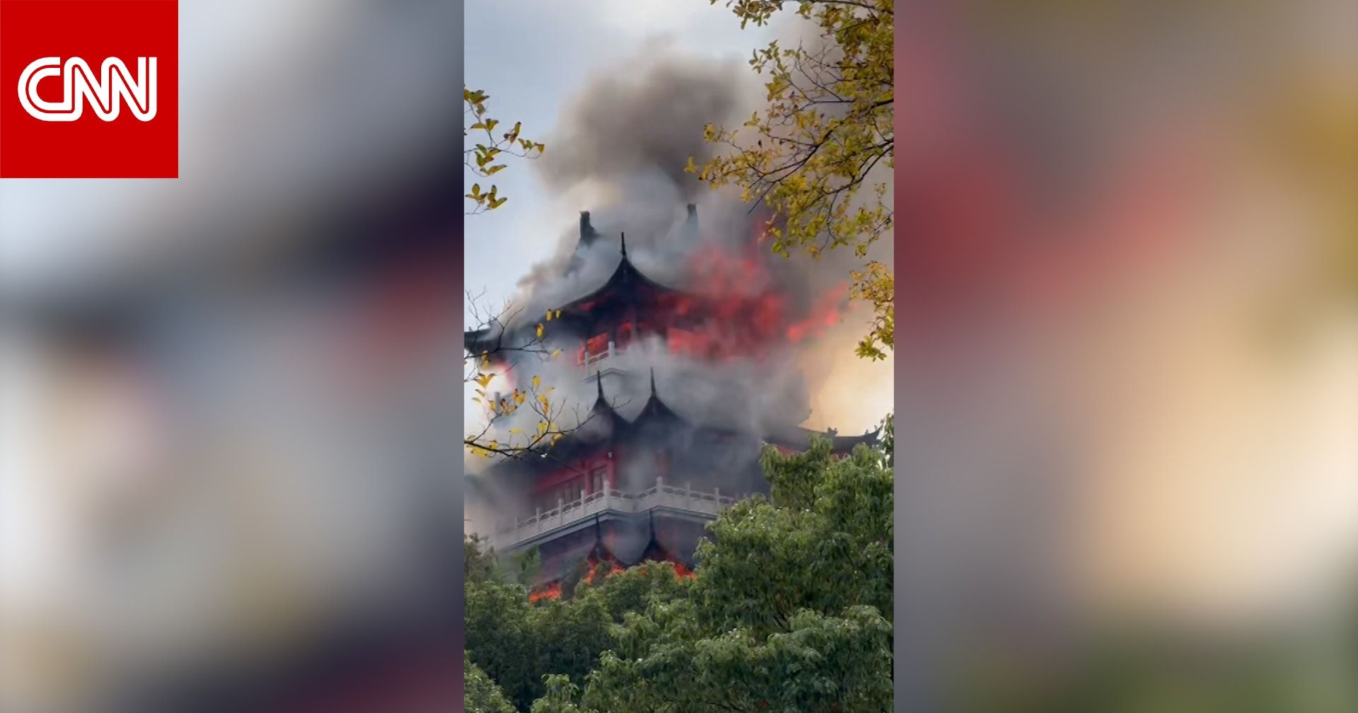 التهمت النيران معظم واجهة مبنى جناح نانتشانغ في مقاطعة جيانغسو شرق الصين، الذي تم بناؤه في عام 2009 وتم تصميمه على غرار معبد يونغتشينغ التاريخي.