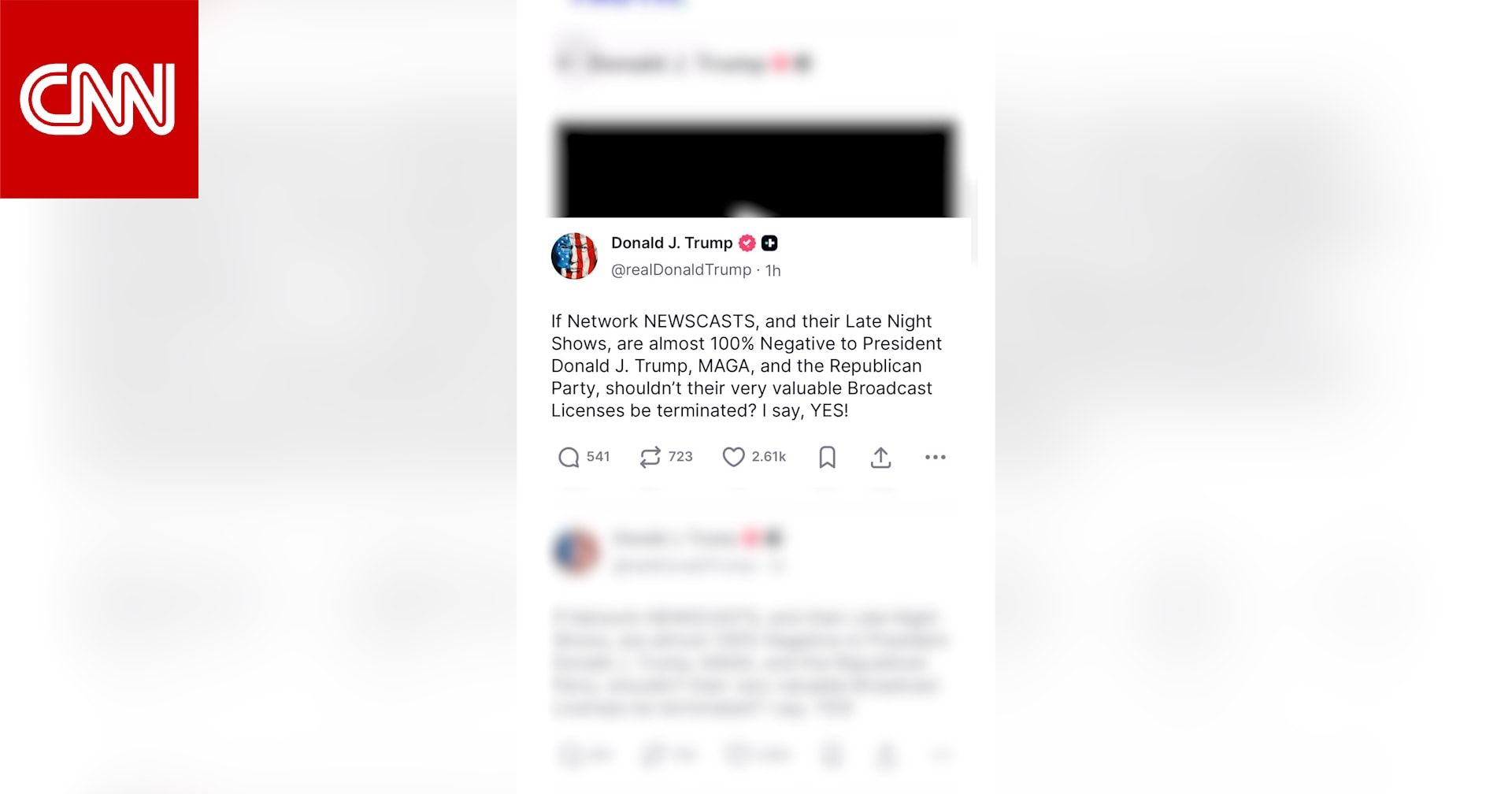 انتقد الرئيس الأمريكي، دونالد ترامب، مقدمي البرامج الليلية في شبكات ABC وNBC وCBS خلال سلسلة من المنشورات على منصة "تروث سوشيال”، كما قال ترامب إنه يجب إلغاء تراخيص أي شبكات إعلامية تنتقد الحزب الجمهوري.