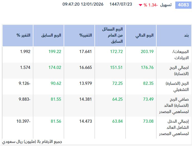 وحققت الشركة إيرادات بلغت 203.19 مليون ريال بالربع الرابع من عام 2025م، مقابل 172.72 مليون ريال في الربع ذاته من العام السابق؛ لتزيد بنسبة 17.64%.