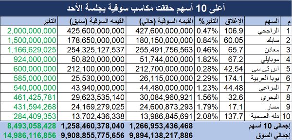 وسجل سهم "الراجحي" أعلى المكاسب السوقية بنحو ملياري ريال، ليصعد رأس المال السوقي للسهم إلى 427.6 مليار ريال، مقابل 425.6 مليار ريال بالجلسة السابقة.
