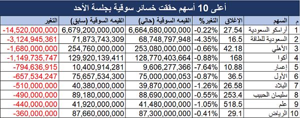 ويف المقابل، تصدر سهم شركة أرامكو السعودية الخسائر السوقية بنهاية جلسة اليوم الأحد، بعد أن فقد 14.52 مليار ريال من قيمته السوقية، ليهبط رأس المال السوقي للسهم إلى 6.66 تريليون ريال مقابل 6.68 تريليون ريال بالجلسة السابقة.
