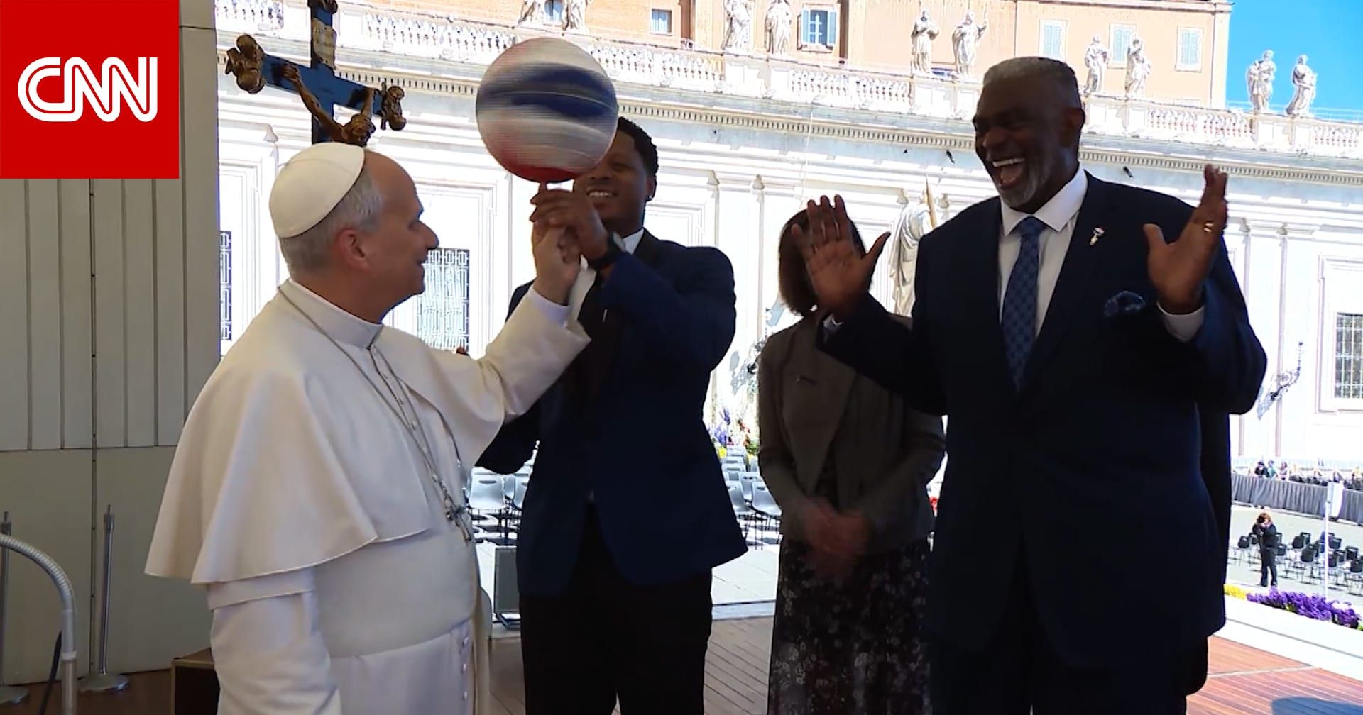 شوهد البابا لاوُن الرابع عشر وهو يُدير كرة سلة على إصبعه في ساحة القديس بطرس خلال زيارة فريق "هارلم غلوبتروترز،" فريق كرة السلة الاستعراضي الأمريكي.