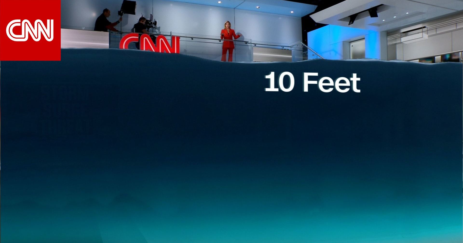 وفي هذا الفيديو، تستخدم مذيعة شبكة CNN، كيت بولدوان عرضًا مرئيًا لتوضيح كيف يبدو ارتفاع مستوى المياه الناتج عن العاصفة بارتفاع 10 أقدام.