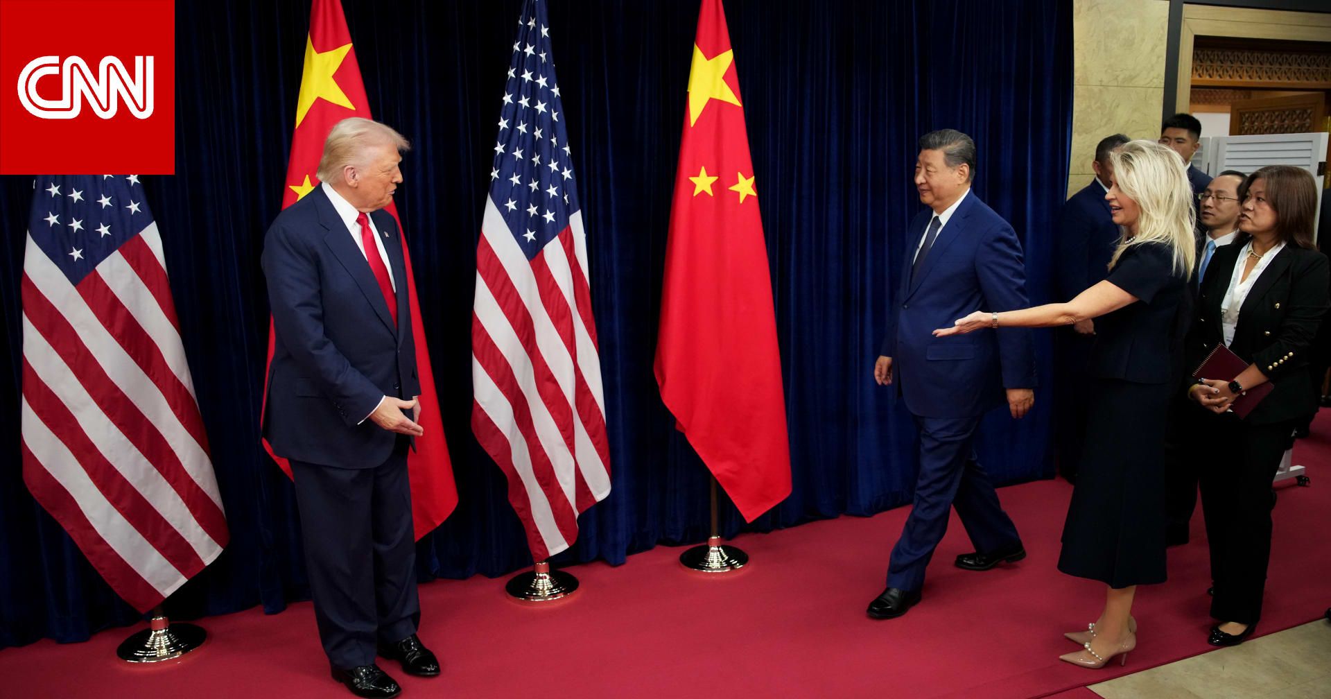 وغادر ترامب القاعة أولاً، حيث استقبله نظيره الصيني، قال ترامب وهو يصافح شي على سجادة حمراء أمام علمين أمريكيين وآخرين صينيين: "سعيد برؤيتك مجددًا"، وأضاف ترامب: "لا شك في أننا سنعقد اجتماعًا ناجحًا للغاية ولكنه مفاوض صعب للغاية وهذا ليس جيدًا، ونعرف بعضنا البعض جيدًا".