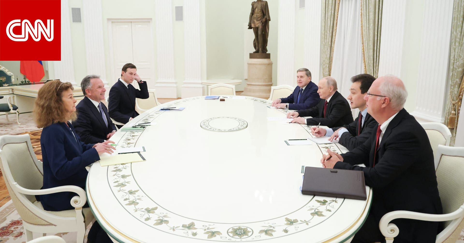 (CNN)-- صرح مساعد في الكرملين، صباح الأربعاء، أن خمس ساعات من المحادثات بين الرئيس الروسي، فلاديمير بوتين، وكبار المفاوضين الأمريكيين لم تُسفر عن أي تقدم يُذكر بشأن اتفاق سلام محتمل في أوكرانيا.